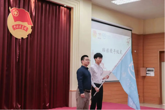 紧接着,校团委代亮书记为第六期学员代表赵思鸿授旗。学员代表接过“青马100”班旗,挥舞旗帜,展示青马班风采。