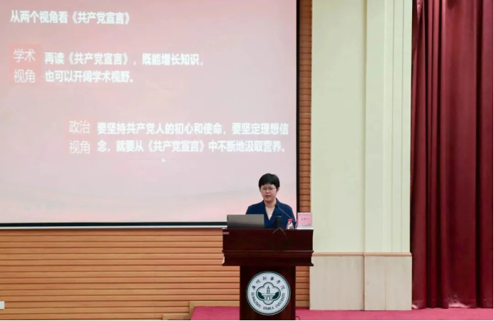 第三个课程,由马克思主义学院林少淇老师为我们解读《共产党宣言》。通过一段小视频学习,讲述了习近平总书记关于学习马克思主义理论的精神实质以及近年来西方媒体对《共产党宣言》的评价,深刻地向全体学员指出了学习共产党宣言的重要性。紧接着又带领大家一起从《共产党宣言》发表的历史背景、主要结构、主要内容与观点、定位、本质特征和其现实意义四个方面明确其对中国发展的重要性。