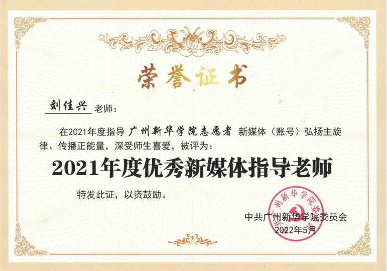 (图六:刘佳兴老师荣获“2021年度优秀新媒体指导老师”荣誉称号)