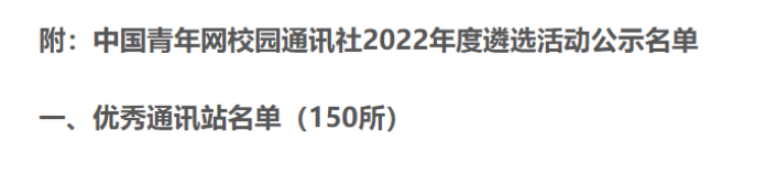 近日,中国青年网举办“中国青年网校园通讯社2022年度遴选活动”。经作品初审、网络展示、打分复审、年度考核等环节,我校团委于遴选活动中获得优秀通讯站称号;我校团委副书记、中青网校园通讯站指导老师陈忱老师获得优秀指导教师称号;我校团委2021级汉语言文学专业余欣苒同学获得优秀通讯员称号。