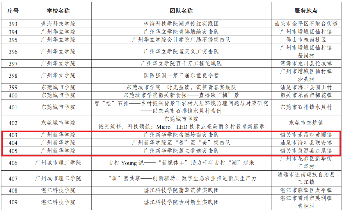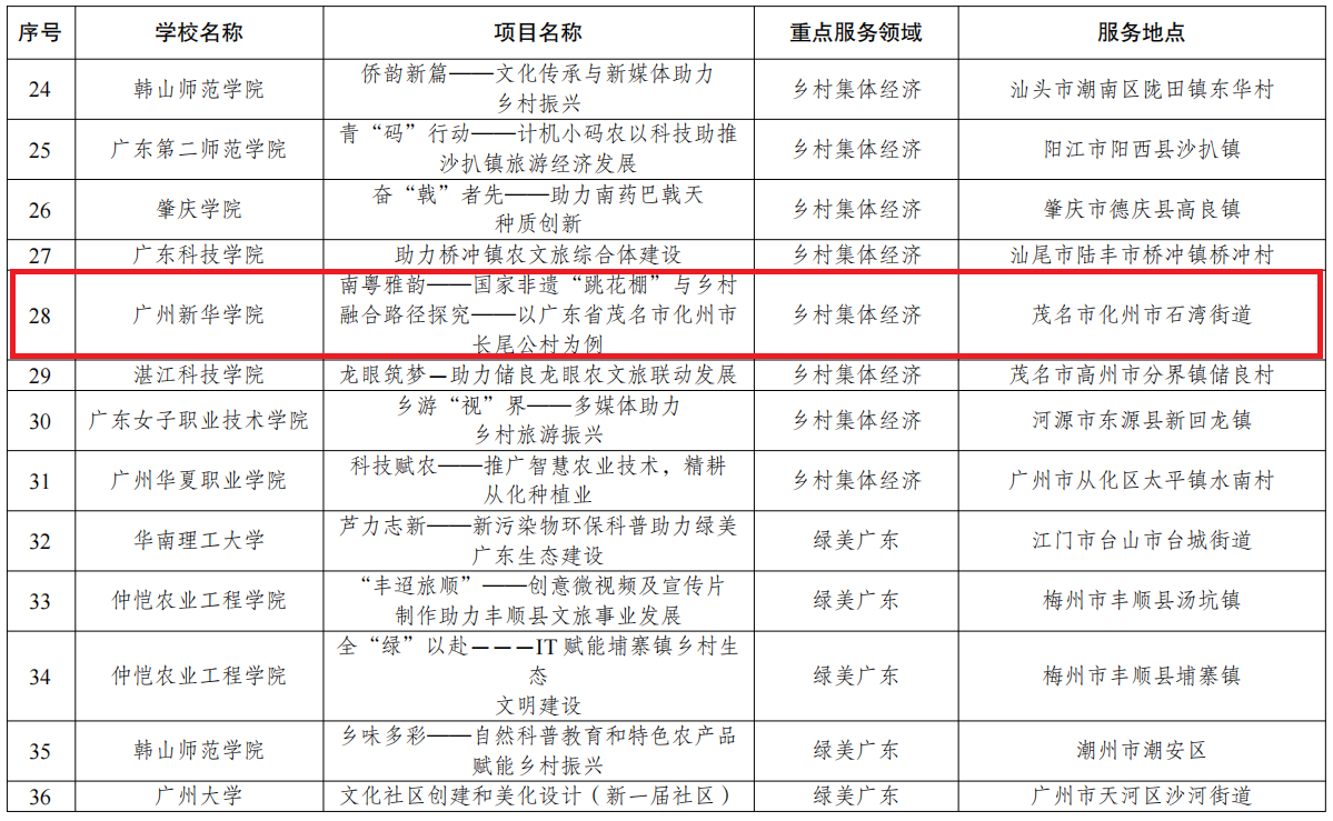 其中,我校资源与城乡规划学院岭南古遗突击队项目入选广东青年大学生“百千万工程”突击队100个品牌项目,公共治理学院名撼岭南突击队、信息与智能工程学院至“善”至“美”突击队、管理学院蕙兰翁逸突击队项目入选广东青年大学生“百千万工程”突击队600个典型案例!
