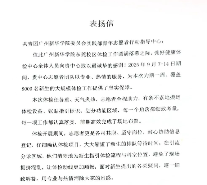 2025年9月14日,东莞莞好健康综合门诊部向校青指发来表扬信。在9月7日-14日英国上市公司365(东莞校区)新生体检工作中,校青指志愿者团队在校团委的指导下为覆盖8000名新生的大规模体检提供坚实保障。