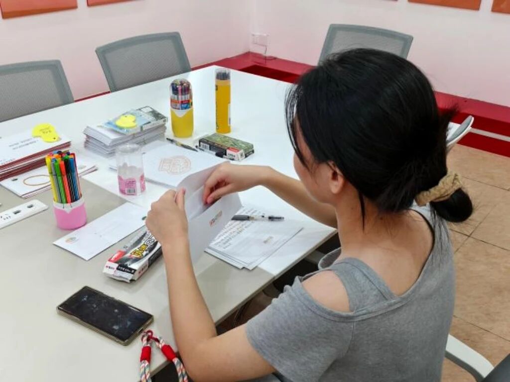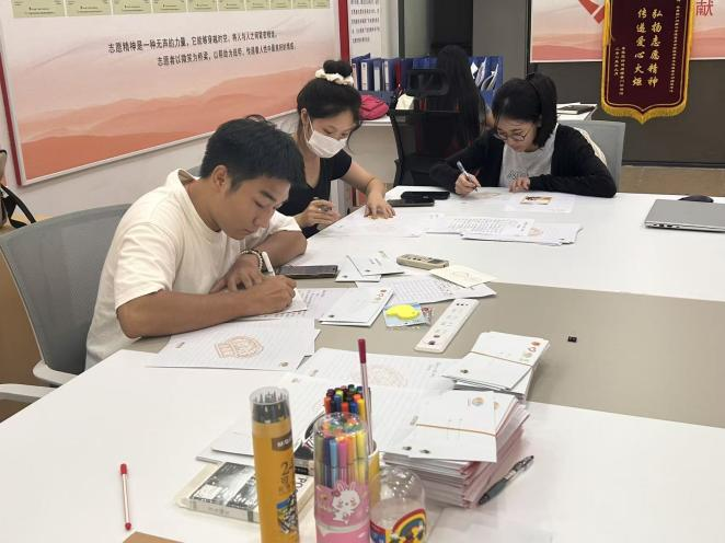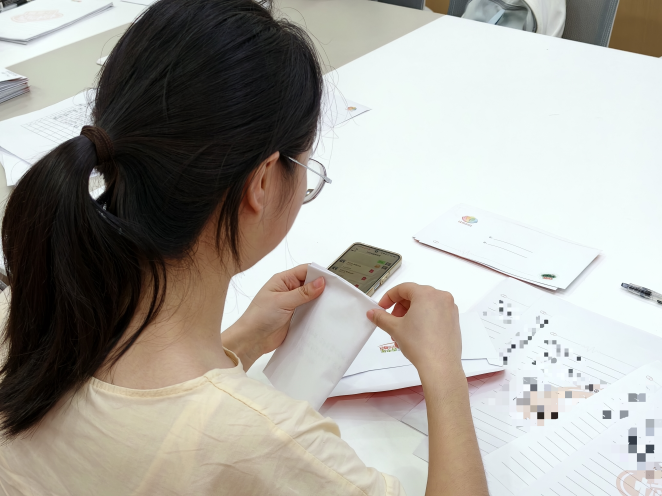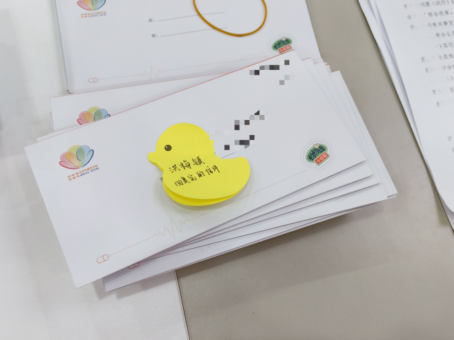 信封被写上编号,确保每一封都能回到原主人手里。信封上面的编号像是在提醒:“你的信件曾被陌生人认真接住过。”志愿者把58封信按镇街分类装好,一切都是那么地井然有序。封口前,大家在信封上贴上一枚贴纸,亦或画上可爱的小表情,像给信封加上封印。“让信把我们的美好祝福带回给他们。” 最后一道工序:写上收信人信息以及志愿者的信息,确保收信人第一时间知道——“这是一封有来处的回信,也是一场被认真收听的青春。”
