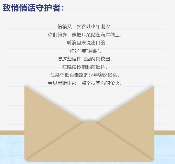彩色墨水在指尖开花,纸面被笔锋悄悄染上斑斓。志愿者一句一句斟酌:给被功课困住的小家伙支招——“把大题切成小关,一路打怪升级”;碰到他们分享的小确幸,就用荧光笔补个咧嘴的笑脸,再附一句“愿你收藏这份亮晶晶”;若嗅到和伙伴闹别扭的委屈,便化身影院里的调解员——“小插曲换个和弦,就能弹成更甜的前奏”。当墨迹一行行落脚,他们像踩着时光隧道回到自己的十六岁——也曾被试卷淹没、因一朵花开心、把冷战写进日记。正因为踩过同样的水洼,他们更懂这页纸有多沉:写下的不是墨水,是隔着岁月的“嗨,我懂你”,让每一封信件都收到回声——“你的声音,我在这头听见了”。