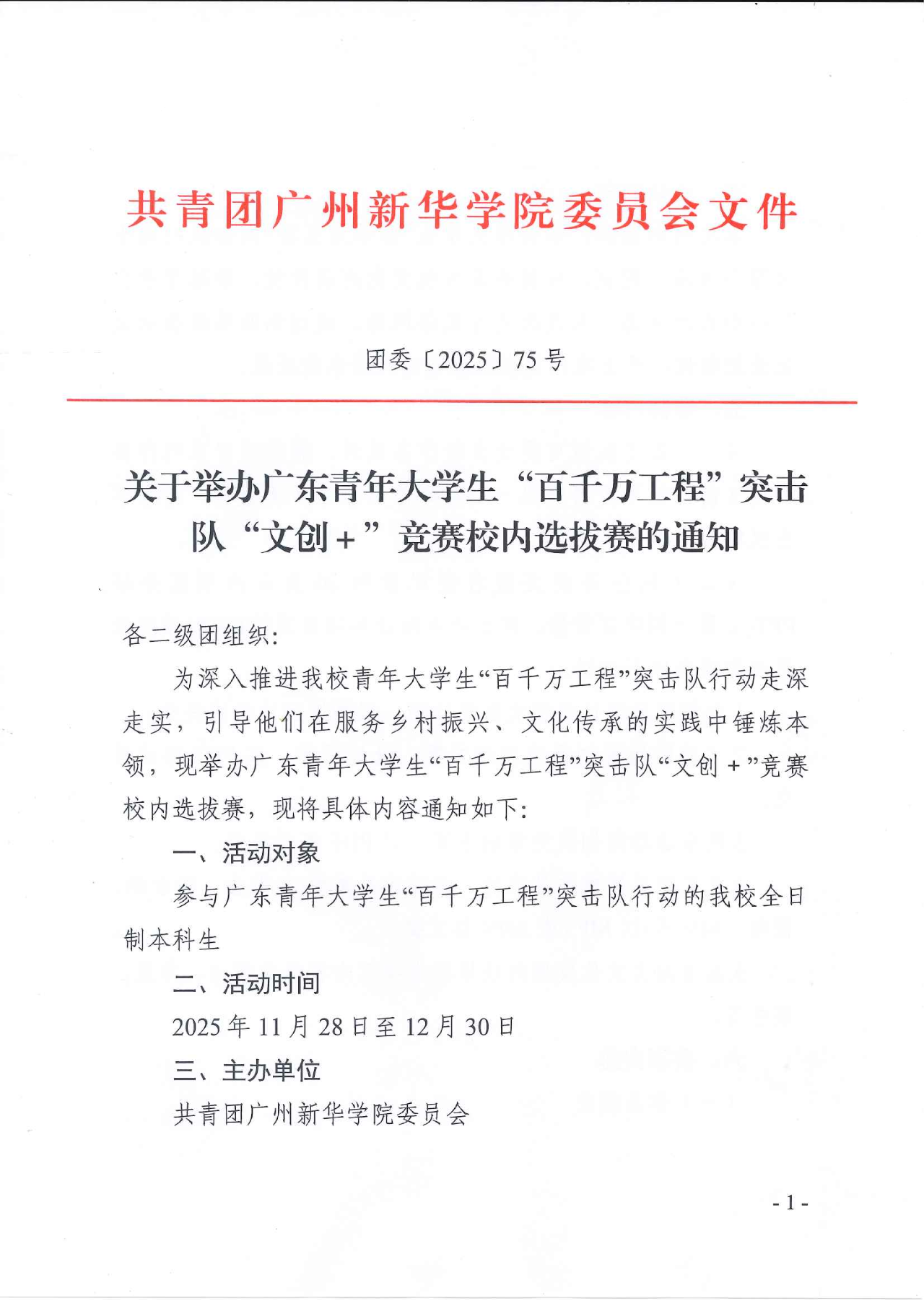 为深入推进我校青年大学生“百千万工程”突击队行动走深走实,引导他们在服务乡村振兴、文化传承的实践中锤炼本领,现举办广东青年大学生“百千万工程”突击队“文创+”竞赛校内选拔赛,现将具体内容通知如下:
