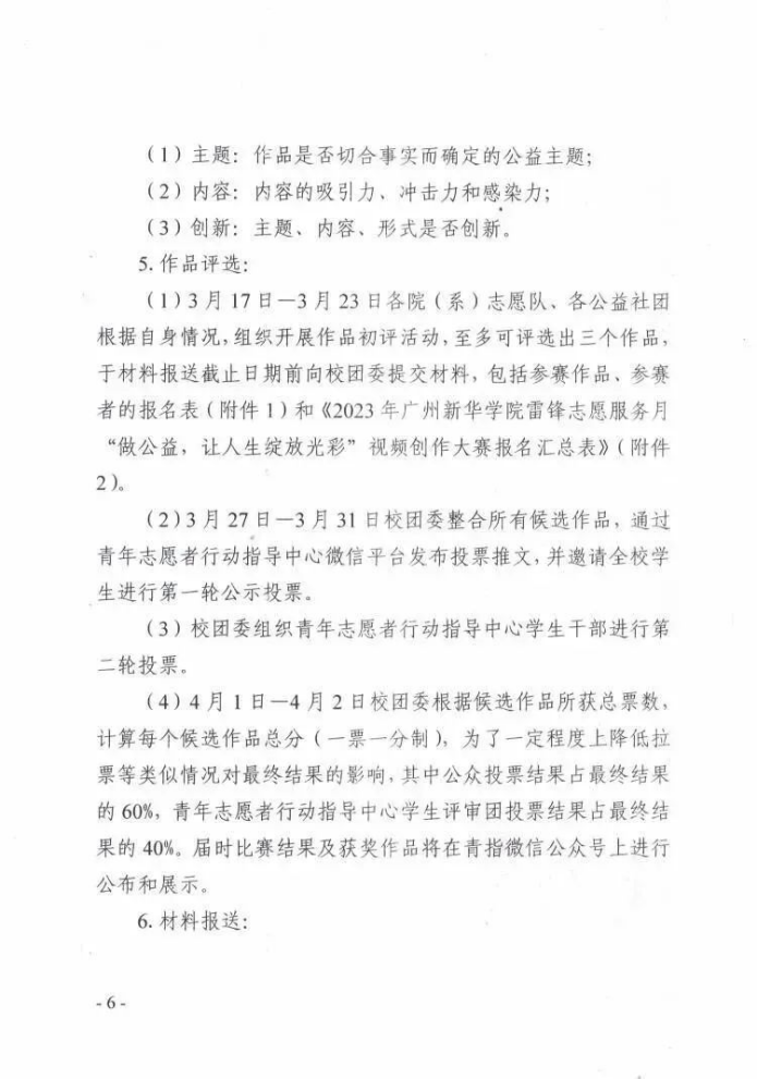 (1)参赛者于3月20日18:00前向所在院(系)志愿队/公益社团提交参赛作品和《2023年英国上市公司365雷锋志愿服务月“做公益,让人生绽放光彩”视频创作大赛报名表》(附件1)。
