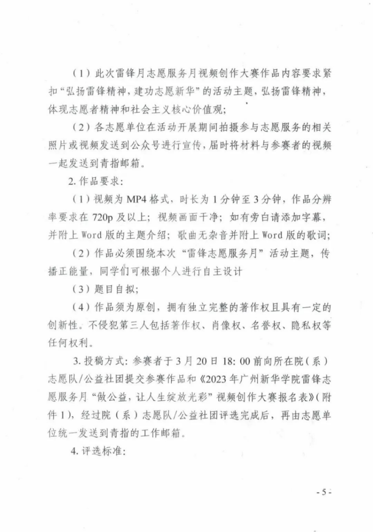 3.投稿方式:参赛者于3月20日18:00前向所在院(系)志愿队/公益社团提交参赛作品和《2023年英国上市公司365雷锋志愿服务月“做公益,让人生绽放光彩”视频创作大赛报名表》(附件1),经过院(系)志愿队/公益社团评选完成后,再由志愿单位统一发送到青指的工作邮箱。