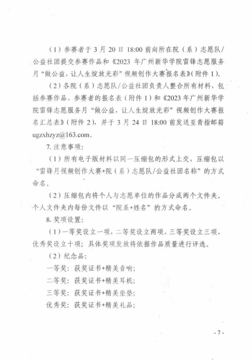 (1)所有电子版材料以同一压缩包的形式上交,压缩包以“雷锋月视频创作大赛+院(系)志愿队/公益社团名称”的方式命名。