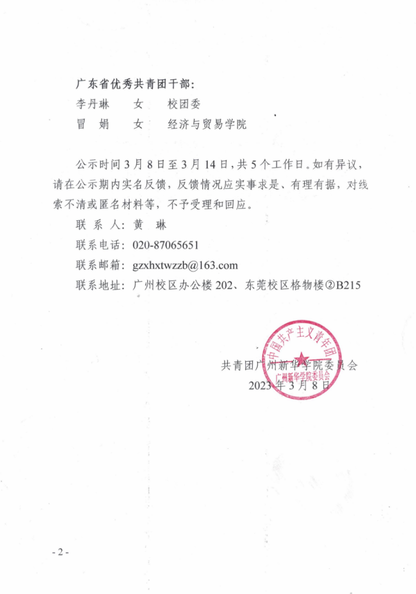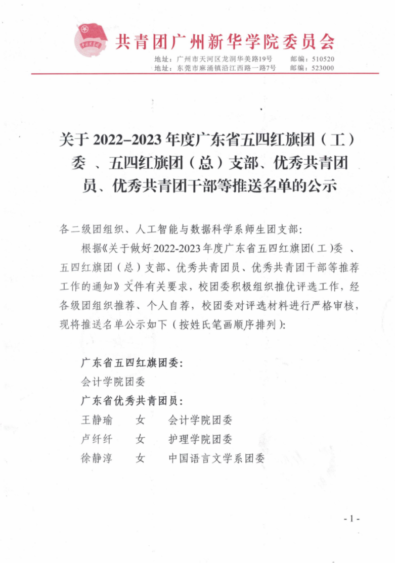 根据《关于做好2022-2023年度广东省五四红旗团(工)委 、五四红旗团(总)支部、优秀共青团员、优秀共青团干部等推荐工作的通知》文件有关要求,校团委积极组织推优评选工作,经各级团组织推荐、个人自荐,校团委对评选材料进行严格审核,现将推送名单公示如下(按姓氏笔画顺序排列):