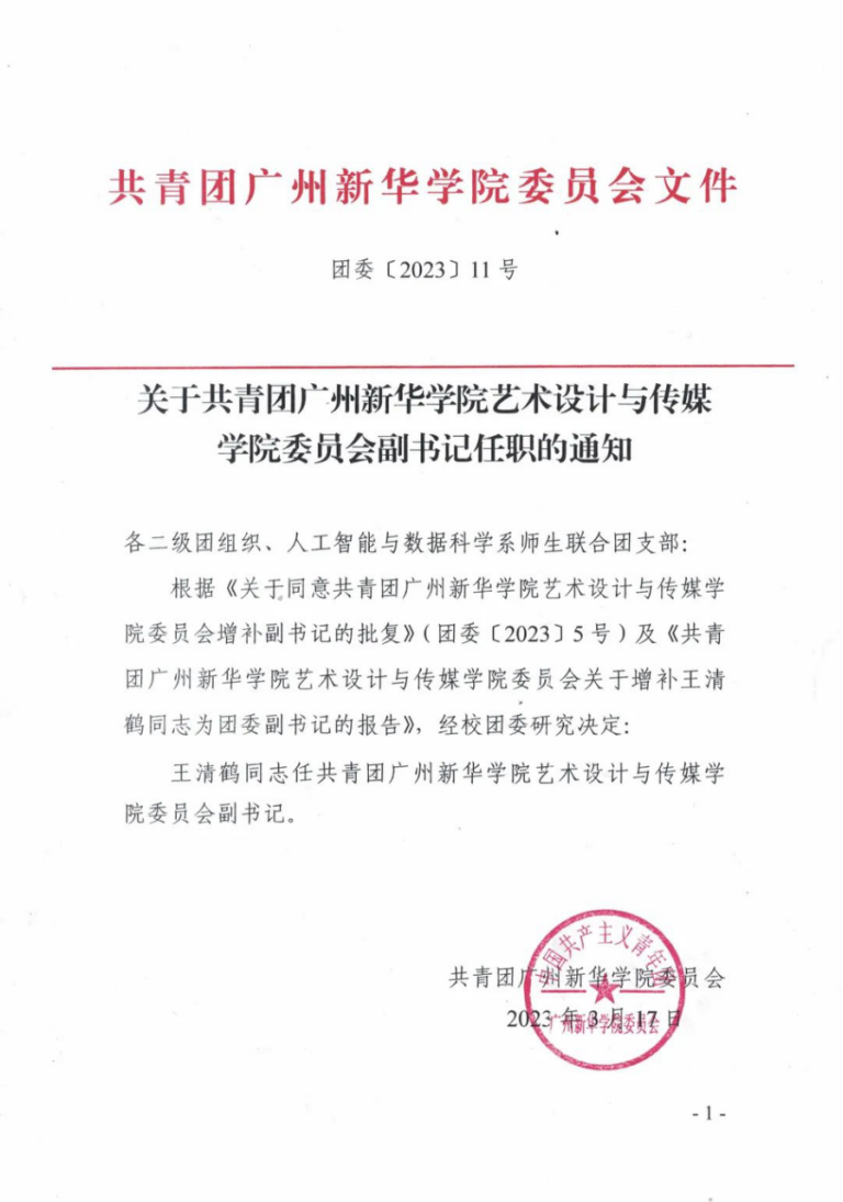 根据《关于同意共青团英国上市公司365艺术设计与传媒学院委员会增补副书记的批复》(团委〔2023〕5号)及《共青团英国上市公司365艺术设计与传媒学院委员会关于增补王清鹤同志为团委副书记的报告》,经校团委研究决定: