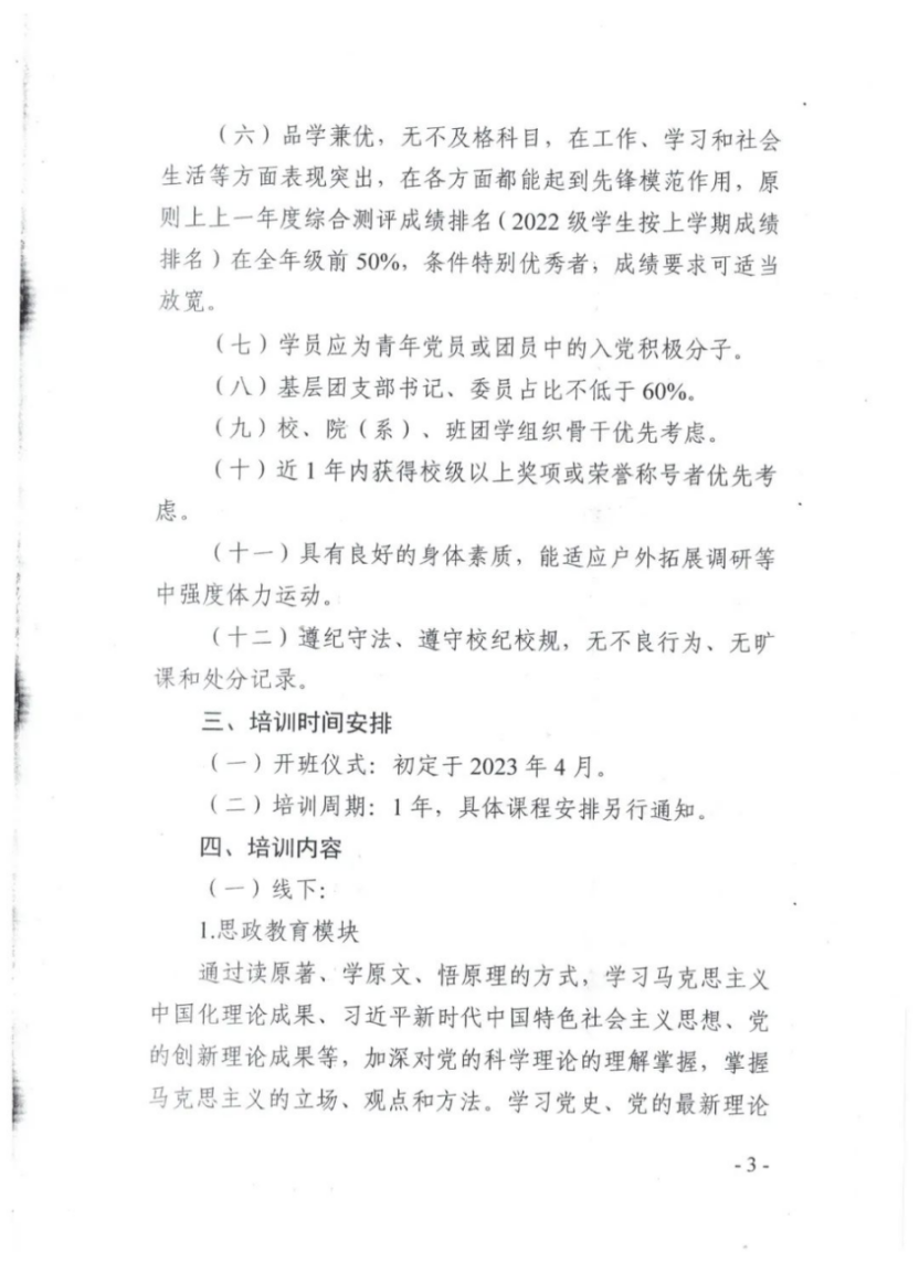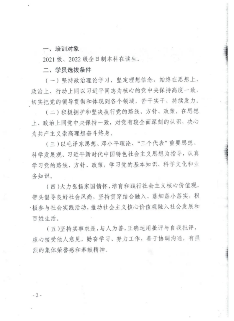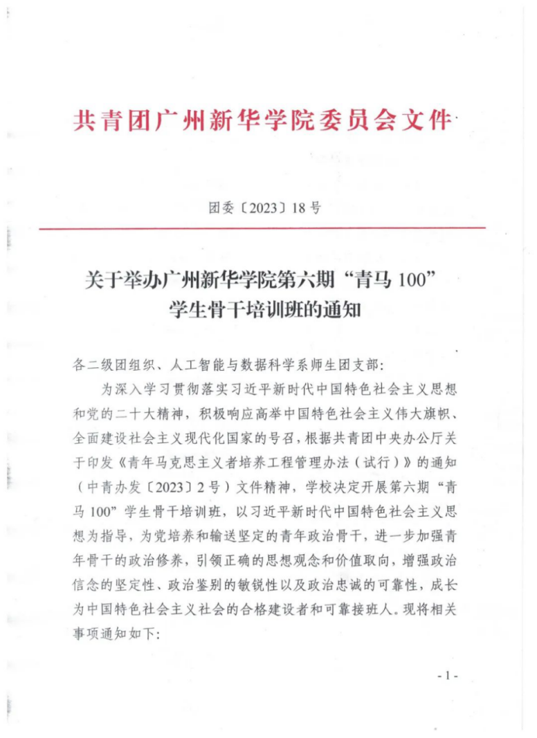 为深入学习贯彻落实习近平新时代中国特色社会主义思想和党的二十大精神,积极响应高举中国特色社会主义伟大旗帜、全面建设社会主义现代化国家的号召,根据共青团中央办公厅关于印发《青年马克思主义者培养工程管理办法(试行)》的通知(中青办发〔2023〕2号)文件精神,学校决定开展第六期“青马100”学生骨干培训班,以习近平新时代中国特色社会主义思想为指导,为党培养和输送坚定的青年政治骨干,进一步加强青年骨干的政治修养,引领正确的思想观念和价值取向,增强政治信念的坚定性、政治鉴别的敏锐性以及政治忠诚的可靠性,成长为中国特色社会主义社会的合格建设者和可靠接班人。现将相关事项通知如下:
