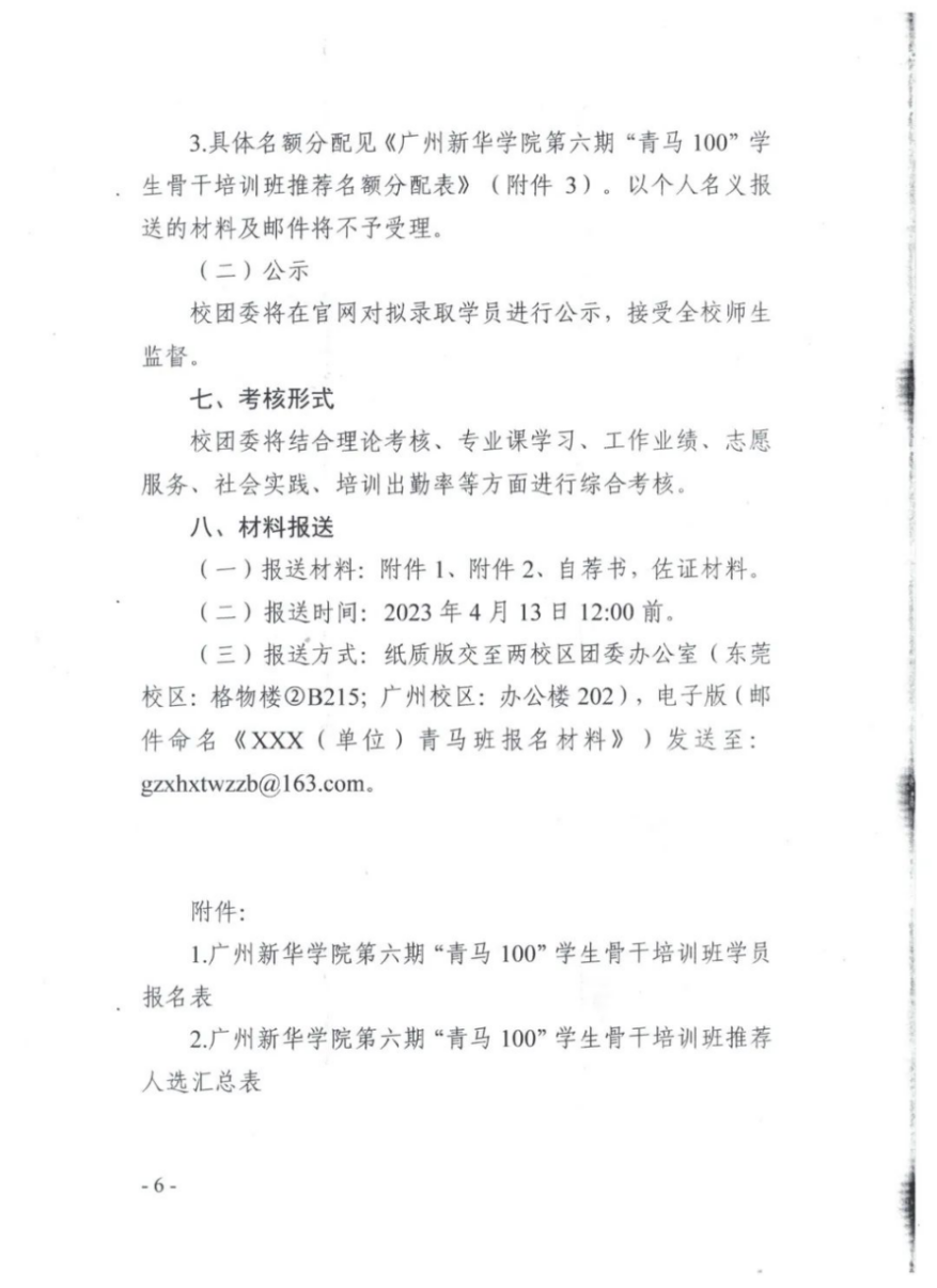 (三)报送方式:纸质版交至两校区团委办公室(东莞校区:格物楼②B215;广州校区:办公楼202),电子版(邮件命名《XXX(单位)青马班报名材料》)发送至:gzxhxtwzzb@163.com。