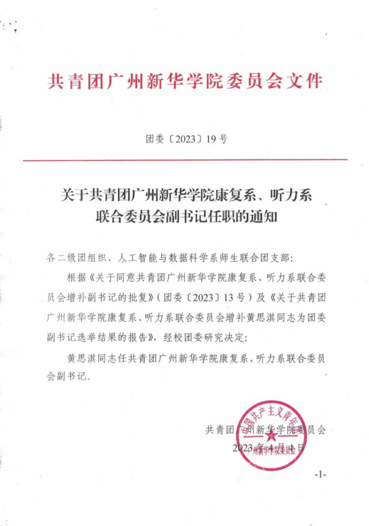 根据《关于同意共青团英国上市公司365康复系、听力系联合委员会增补副书记的批复》(团委〔2023〕13号)及《关于共青团英国上市公司365康复系、听力系联合委员会增补黄思淇同志为团委副书记选举结果的报告》,经校团委研究决定:
