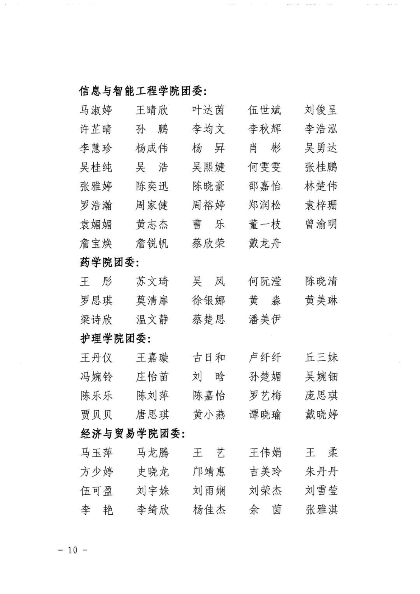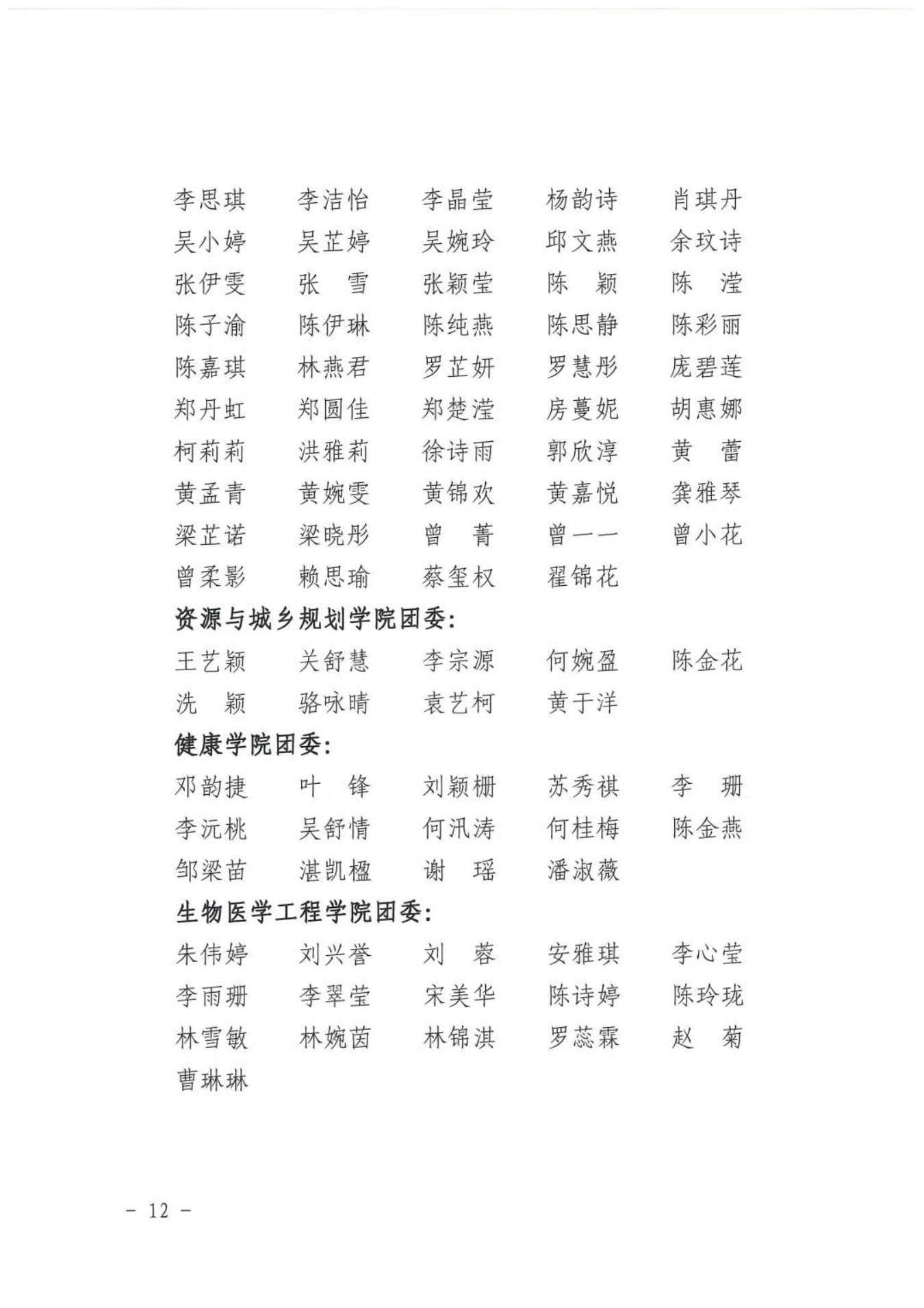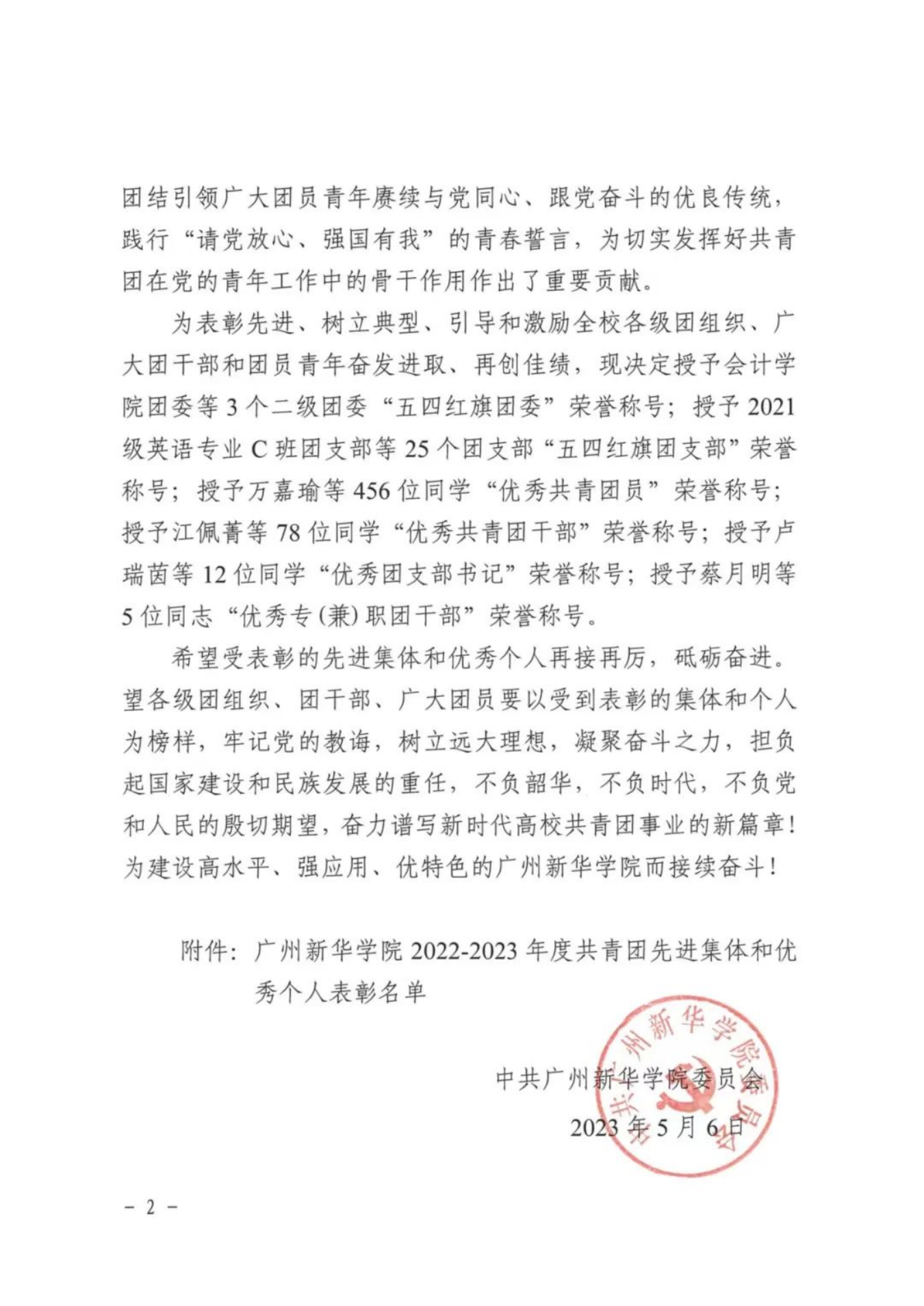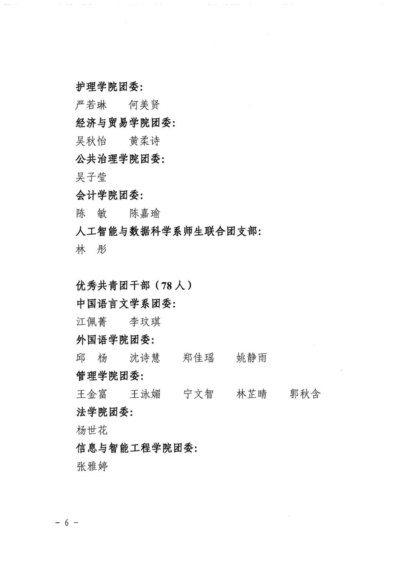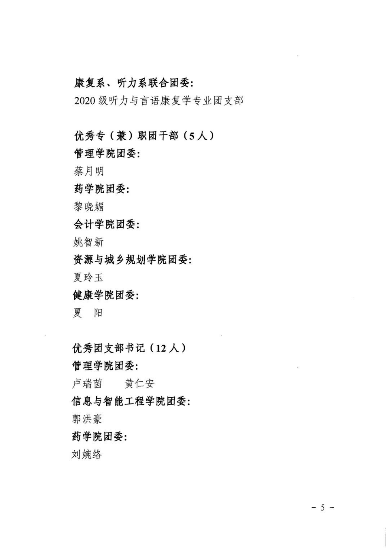 为表彰先进、树立典型、引导和激励全校各级团组织、广大团干部和团员青年奋发进取、再创佳绩,现决定授予会计学院团委等3个二级团委“五四红旗团委”荣誉称号;授予2021级英语专业C班团支部等25个团支部“五四红旗团支部”荣誉称号;授予万嘉瑜等456位同学“优秀共青团员”荣誉称号;授予江佩菁等78位同学“优秀共青团干部”荣誉称号;授予卢瑞茵等12位同学“优秀团支部书记”荣誉称号;授予蔡月明等5位同志“优秀专(兼)职团干部”荣誉称号。
