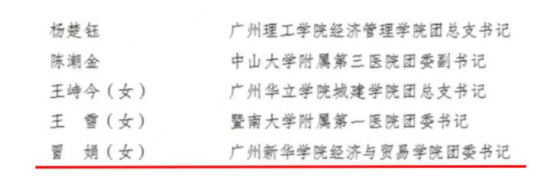护理学院卢纤纤同学、中国语言文学系徐静淳同学获广东省“优秀共青团员”称号,经济与贸易学院团委书记冒娟老师获广东省“优秀共青团干”干部。