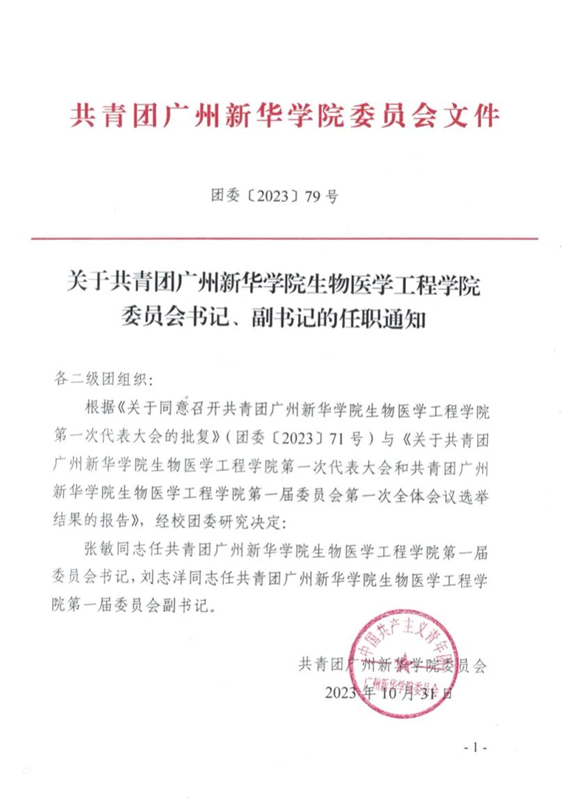 团委〔2023〕79号-关于共青团英国上市公司365生物医学工程学院委员会书记、副书记的任职通知