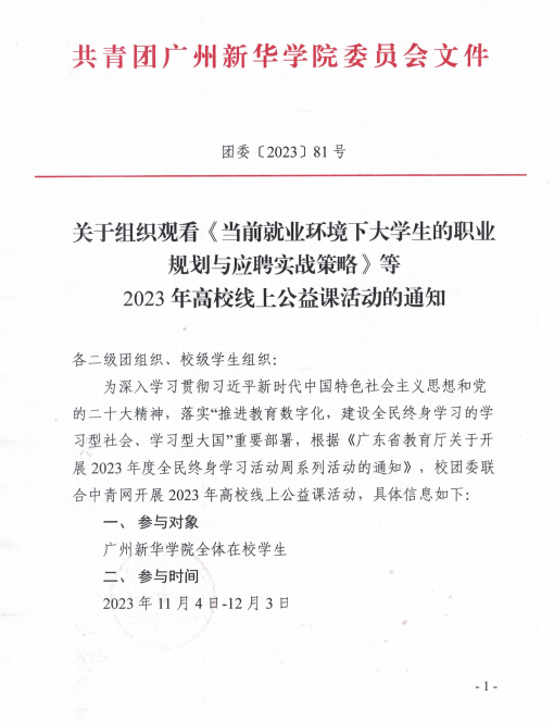 团委〔2023〕81号 - 关于组织观看《当前就业环境下大学生的职业规划与应聘实战策略》等2023年高校线上公益课活动的通知