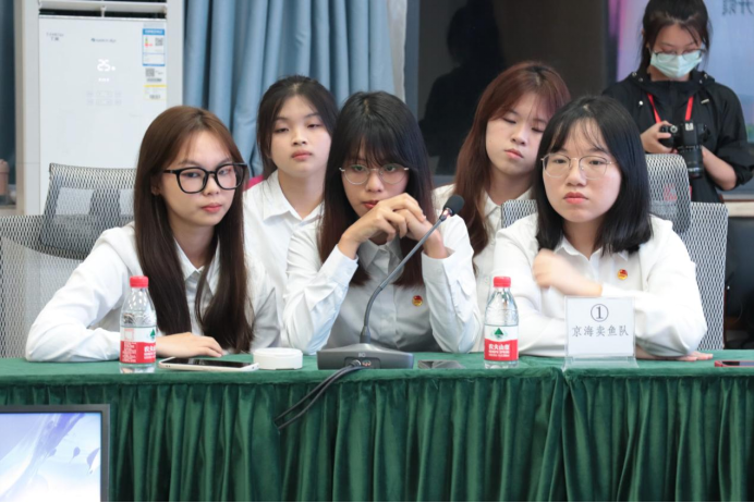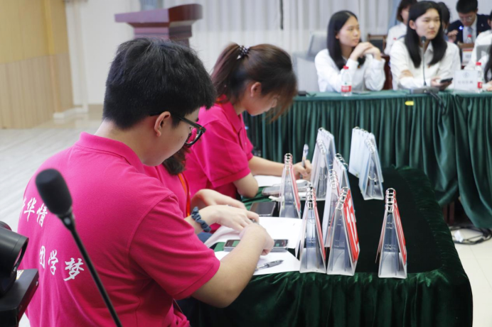 最后,组织部的工作人员进行初赛统分环节,同时大屏幕上播放与传统文化有关的宣传视频,选手们观看着视频,在学习中华优秀传统文化的同时,也借此间隙平复自己紧张的心情,为下面的决赛做准备。经比赛比分评审后,主持人最终公布取得前四名的成绩进入决赛的队伍名单,他们分别是来自学生会的“从容应队”、来自办公室的“京海卖鱼队”、来自宣传部的“少年先疯队”以及来自广播台的“第一梯队”。