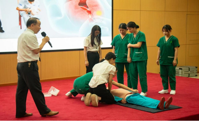 急救与健康教育的重要目的是使各实践团队学会如何应对各种危险突发情况,在能够保护自己的前提下对伤者进行有效的援助。此次急救健康知识培训,由莞好健康单位陈广民主任进行讲解。陈广民主任对急救与创伤知识的重要性进行阐述,强调其在“三下乡”过程和日常生活中均有重要意义。接着陈主任详细介绍了心肺复苏CPR的相关知识和技能、创伤急救基本措施等急救技能。莞好健康单位的彭爱红主任与三名护士现场进行技能展示教学,更加生动地展现了急救技能的正确操作方式。