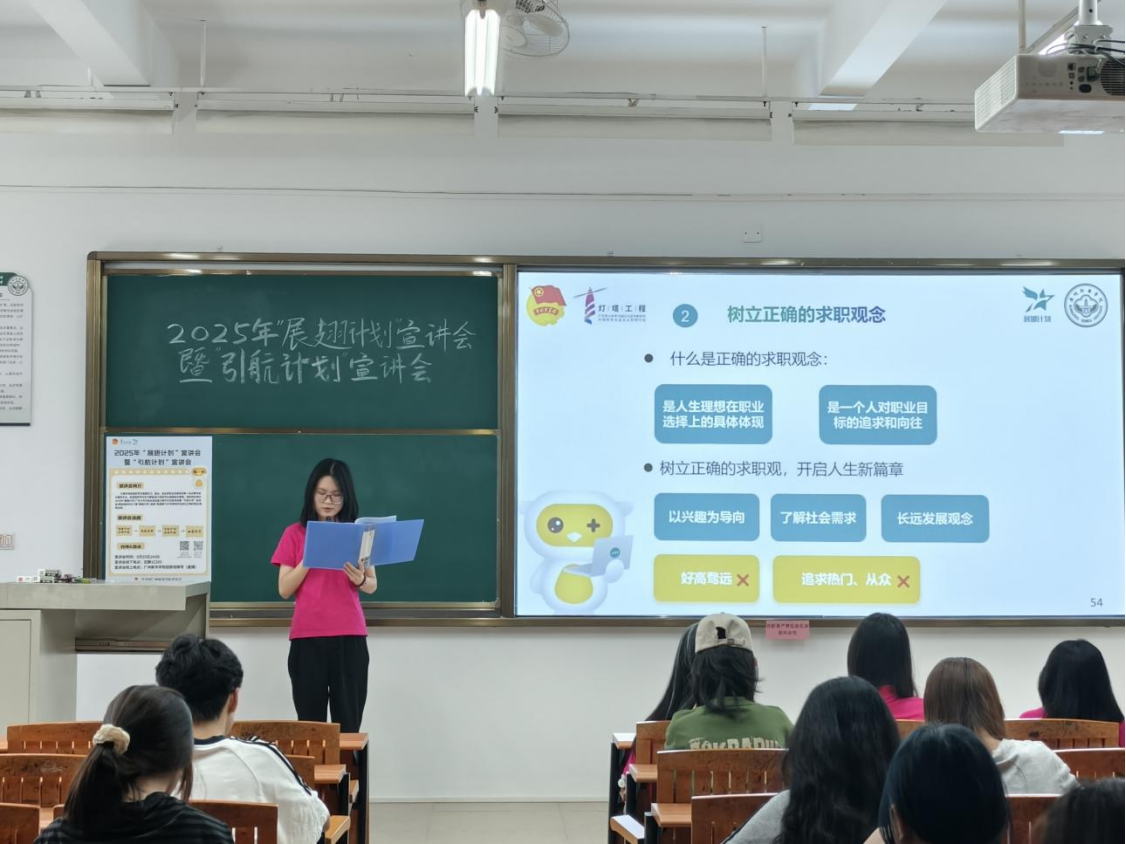 为搭建实习、就业、创业和职业技能培训等一站式青年成长服务平台,拓宽学生实习渠道,助力我校学生成就自我梦想,校团委特此举办2025年“展翅计划”广东大学生就业创业能力提升行动暨“引航计划”宣讲会,帮助学生们进一步熟悉"易展翅"APP的使用,同时树立正确的就业观择业观。