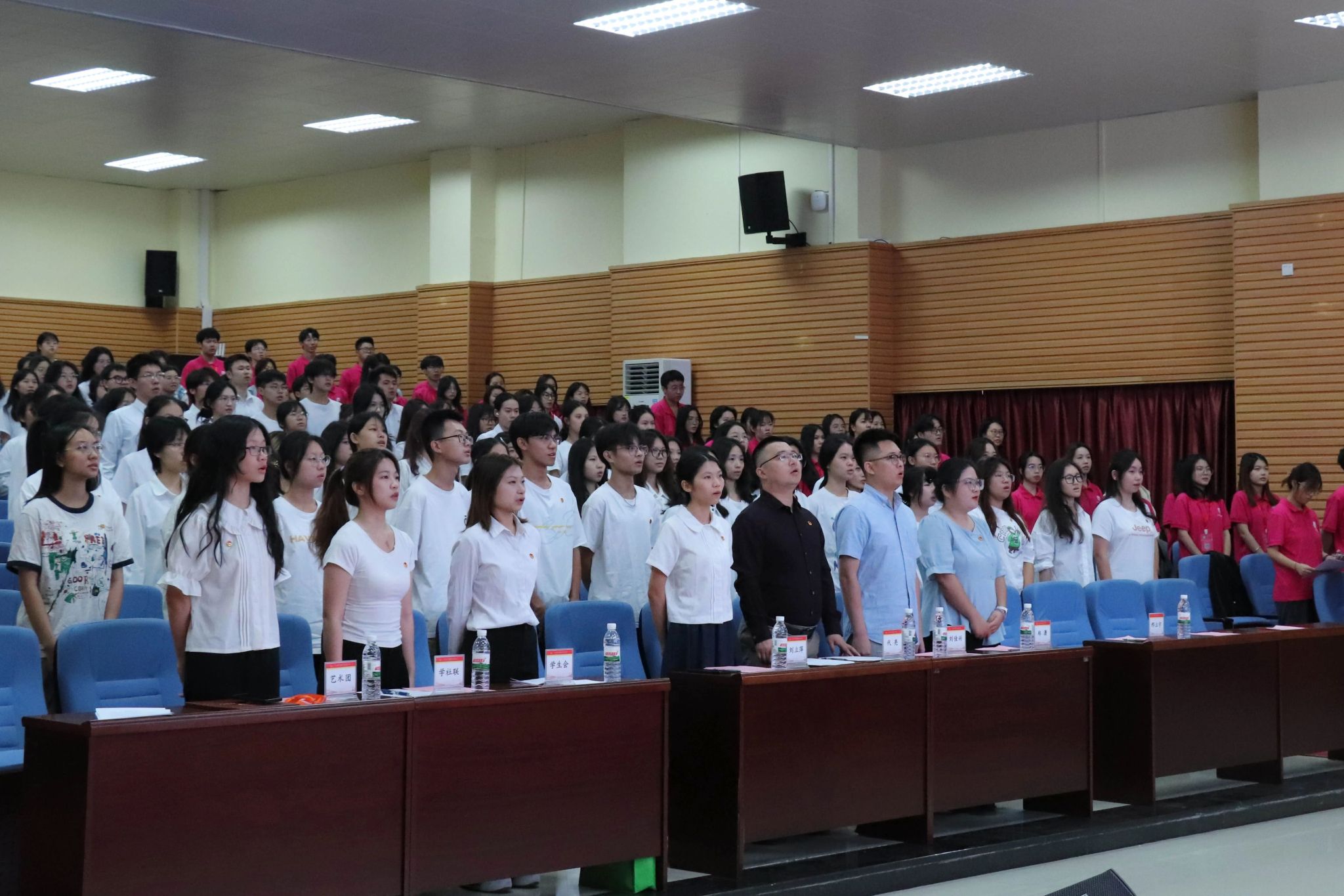 伴随着共青团团歌《光荣啊,中国共青团》的奏响,全体成员起立,昂首挺胸,目光坚定明亮,共同唱响团歌,歌声中洋溢着青春的热情与对未来的憧憬,大会正式拉开序幕。