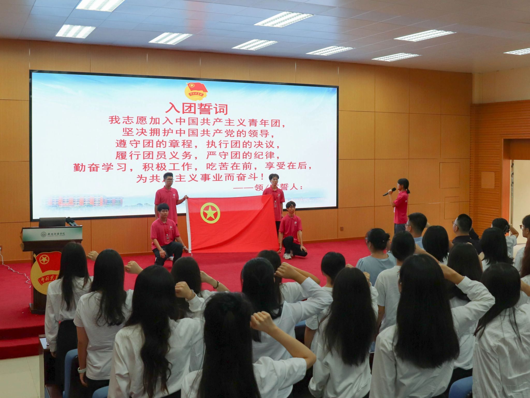 大会全体成员在领誓人的带领下,重温入团誓词。一字一句,铿锵有力,不仅是对过往承诺的回顾,更是对未来责任的坚定承诺,展现了共青团员们积极向上、勇于担当的精神风貌。
