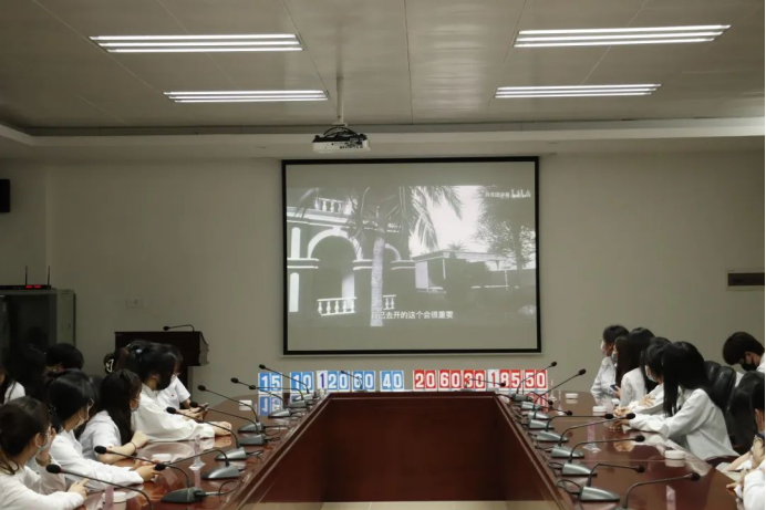 最后,工作人员进行初赛统分环节,同时大屏幕上播放团史学习视频,现场的老师与同学们共同回顾了中国青年在血与火的考验中为了家国而奋斗的光荣历程,悟初心谱新篇,致敬百年峥嵘岁月。经比赛比分评审后,主持人最终公布取得前四名成绩进入决赛的队伍名单,他们分别是来自宣传部的“争取全队”、来自办公室的“团团队”、来自组织部的“开拓者队”以及来自实践部社实的“从容应对队”。