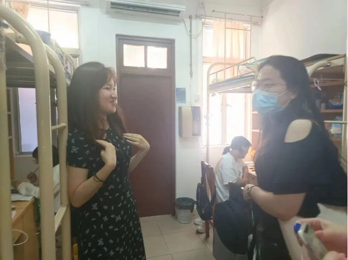 萌新入住后,班导生走访宿舍,了解同学们对新环境的适应情况,给予入学后关于学习以及未来规划的建议,帮助同学们解决生活中的困难。