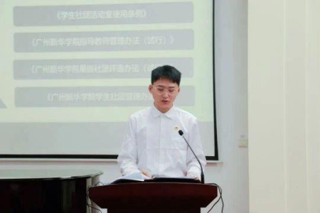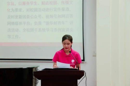 在全体合唱后,校团委办公室、组织部、宣传部、实践部以及校学生会、校学联社和校艺术团的学生代表们先后上台发言,分别介绍了所在部门及组织的职能、工作内容,并对过去一年的工作做出总结以及对未来的展望。各代表对加入校团委的新成员表示热烈的欢迎以及热切的期许,希望新成员们做有理想、敢担当,肯吃苦、勤奋斗的新时代青年,牢记作为团学干部的职责使命。