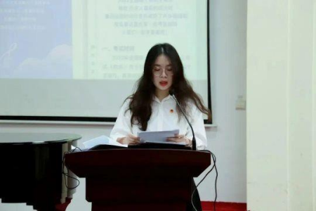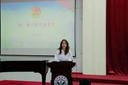 接下来,来自组织部2022级新生代表梁君聆同学上台发言,她代表广大新成员对这段时间师兄师姐、老师们的帮助指导表达了感谢,同时表达了新成员积极迎接新挑战的决心,发出了勇担当,做奉献,敢创新,不忘历史,知行合一,秉持初心,互帮互助的庄重宣言。