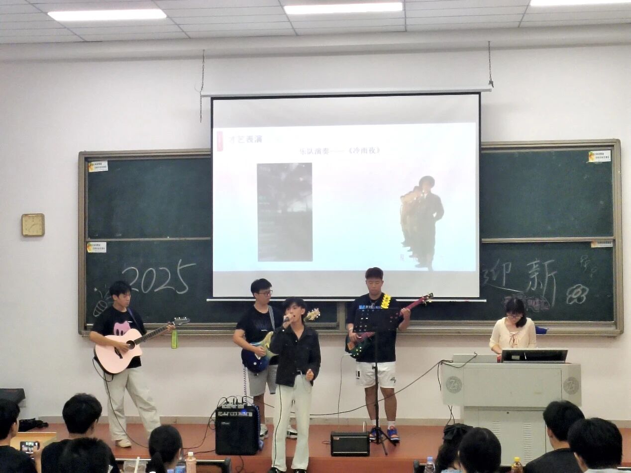 第三个节目是乐队演奏《冷雨夜》,乐队成员有2023级李创城、2023级黄刚杰、2023级袁家轩、2024级许梓阳以及新生初绽2025级万鸿雁,乐队的准备之充足、现场的效果之震撼,现场观众为之疯狂,成为此次迎新茶话会最燃的记忆点,彻底将茶话会的氛围推向高潮。