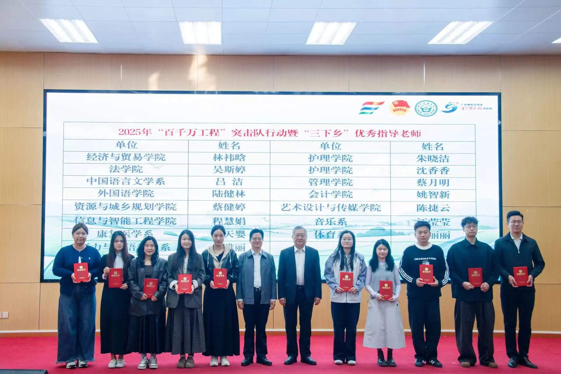 在优秀团队展示环节,在“三下乡”中表现突出的多支优秀团队代表依次进行现场分享,他们以生动讲述结合精美的PPT,将在乡野大地的奋斗故事娓娓道来。药学院药香南澳突击队、康复医学系郁见“脊”康突击队、管理学院古围红耕突击队、艺术设计与传媒学院艺新艺邑突击队依次上台,一个个鲜活的案例、一份份扎实的成果,不仅赢得了现场的阵阵掌声,更为在场师生提供了宝贵的“行动指南”与“经验图谱”。