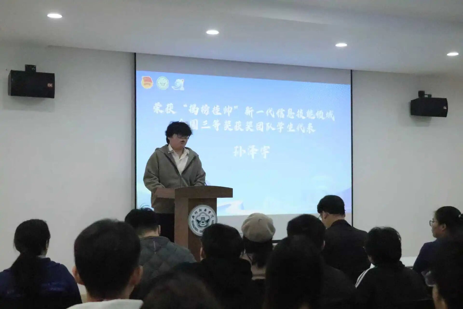 荣获“揭榜挂帅”新一代信息技能领域全国三等奖获奖团队学生代表孙泽宇同学从团队选题、分工、实施到应对挑战,强调方法与坚持的重要性:选题要锚定那些扎根现实的真切痛点,队员间分工明确又彼此托付,以心手相牵的合力穿越重重挑战,让那些闪着光的想法,在时光里慢慢生长为触手可及的现实。