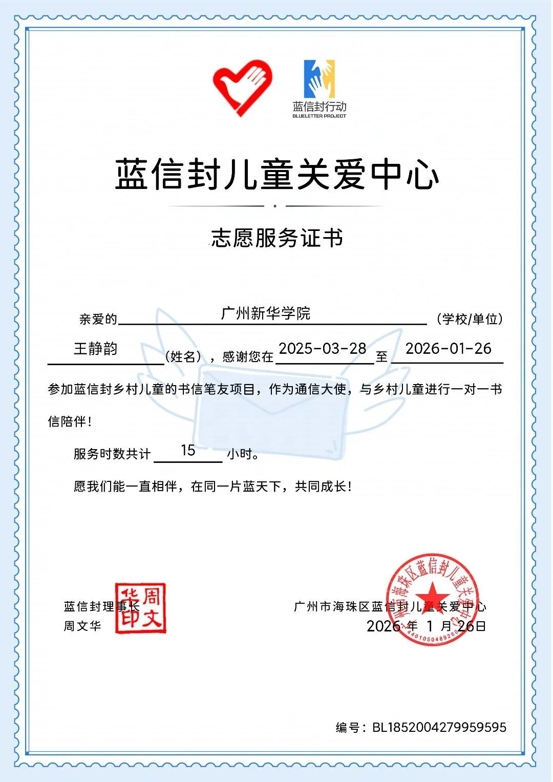 图六:蓝信封志愿服务证书