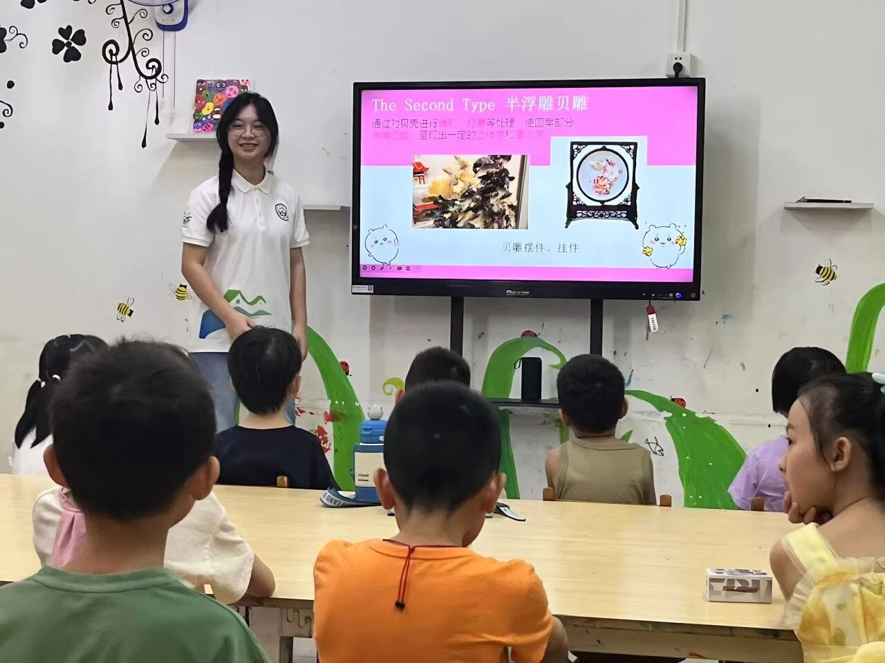 图五:王静韵在汕头市金平区东方街道开展非遗贝雕科普课堂