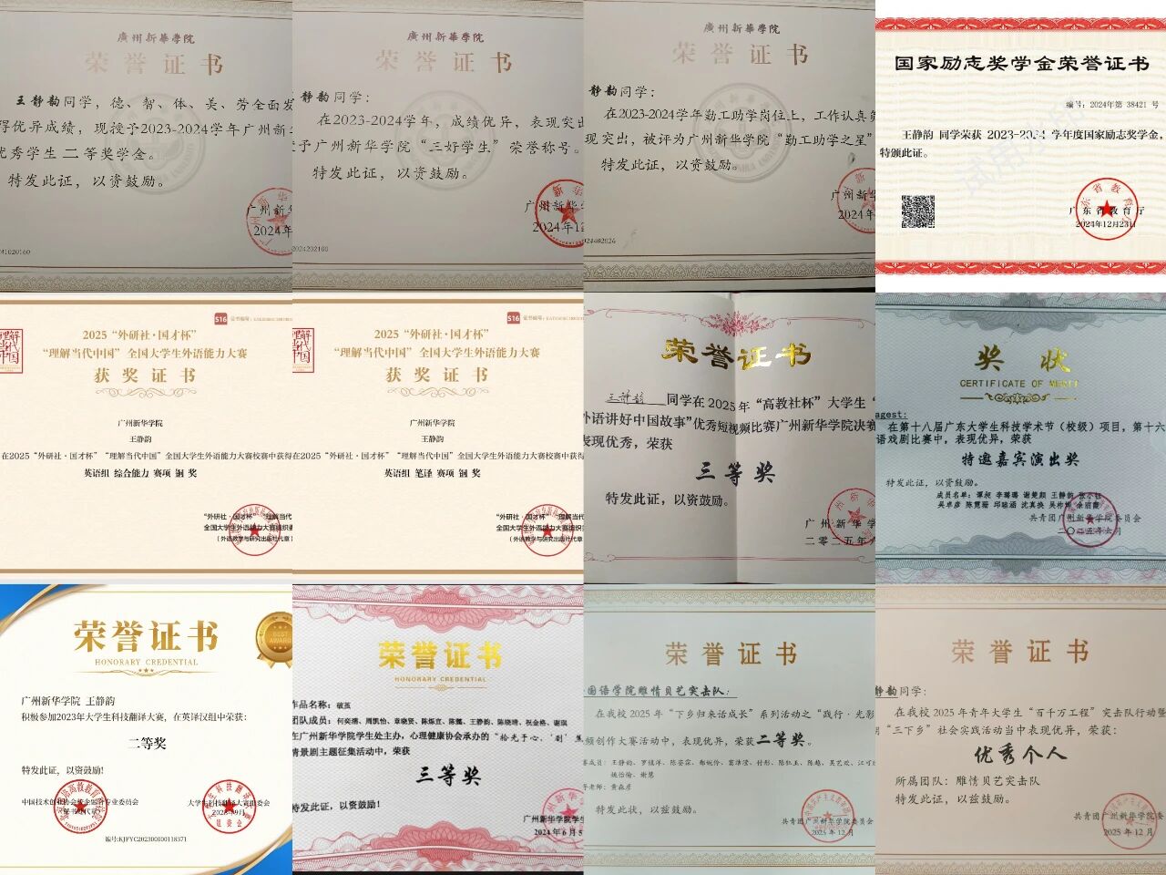 图九:王静韵所获部分荣誉证书