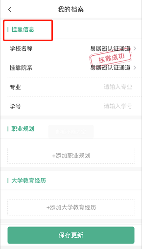 挂靠是指在“易展翅”平台中创建大学生职业成长档案后,将档案信息与所属学校和院系挂靠,此部分内容需如实填写完整。
