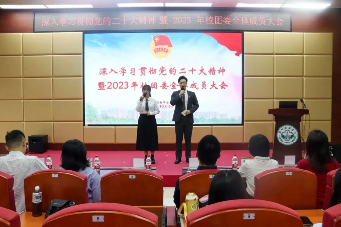为深入学习领会党的二十大精神,用新的伟大奋斗创造新的伟业,我校团委于2023年3月18日上午9:00在广州校区教学楼D101召开“深入学习贯彻党的二十大精神暨2023年校团委全体成员大会”。出席本次大会的有校团委书记代亮同志、副书记黄琳同志、副书记陈忱同志、实践部部长刘佳兴同志、团体部副部长李丹琳同志,校团委各部门干部代表以及全体新生干部。大会由杨丽旸、武秦豪同学主持。