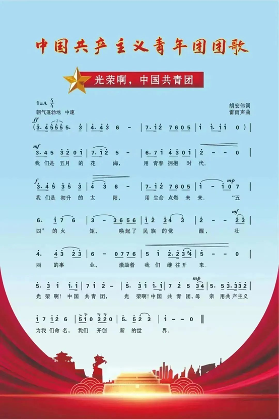 中国共产主义青年团团歌是《光荣啊,中国共青团》,由胡宏伟作词,雷雨声作曲。1988年5月8日,被确定为中国共产主义青年团代团歌。2003年7月22日,被正式定为中国共产主义青年团团歌。